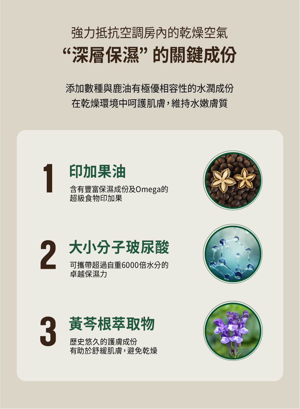 | 全成分 | Water, Butylene Glycol, Glycerin, 1,2-Hexanediol, Caprylic/Capric Triglyceride, Deer fat(5,000ppm), Scutellaria Baicalensis Root Extract, Plukenetia Volubilis Seed Oil, Simmondsia Chinensis (Jojoba) Seed Oil, Squalane, Tocopherol, Ethylhexyl Palmitate, Cyclohexasiloxane, Beeswax, Glyceryl Stearate, Polysorbate 60, Arginine, Ethylhexylglycerin, Sorbitan Stearate, Tocopheryl Acetate, Panthenol, Allantoin, Carbomer, Fragrance |