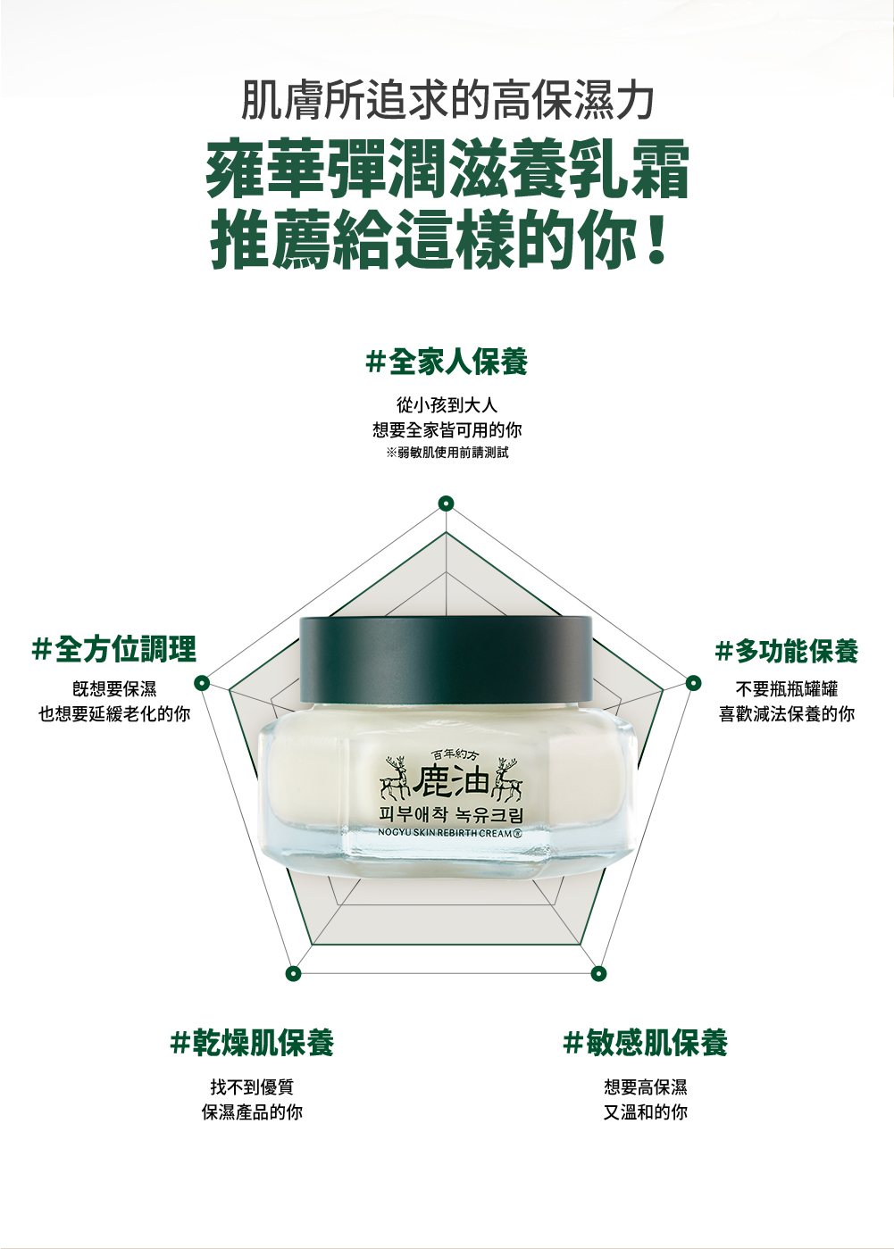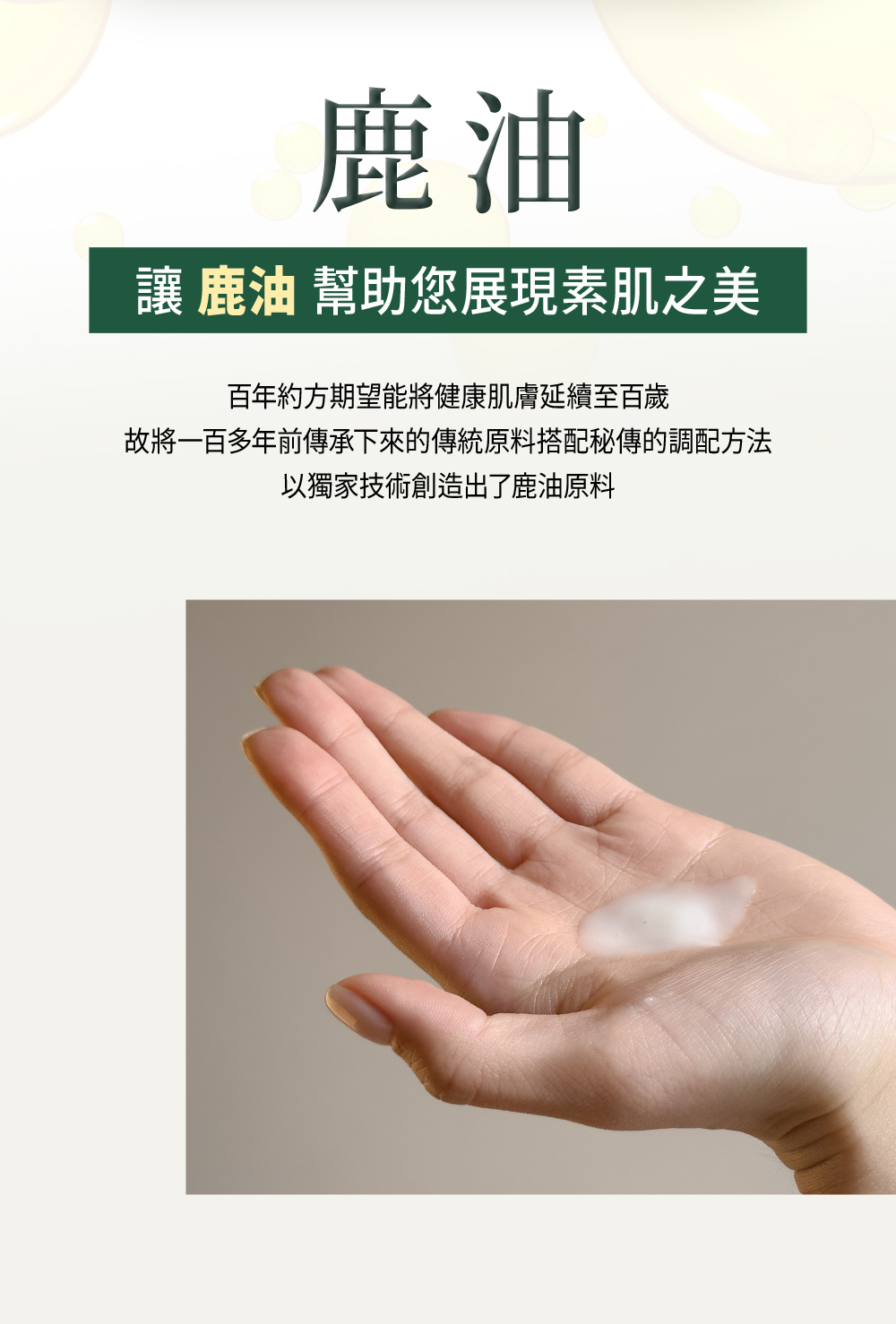 | 全成分 | Water, Butylene Glycol, Glycerin, Deer fat(40,000ppm), Glyceryl Stearate, Cetearyl Alcohol, Squalane, Plukenetia Volubilis Seed Oil, Beeswax, 1,2-Hexanediol, Caprylic/Capric Triglyceride, Cyclohexasiloxane, Polysorbate 60, Scutellaria Baicalensis Root Extract, Laminaria Digitata Extract, Sea Water, Chlorella vulgaris extract, Alteromonas Ferment Extract, Madecassoside, Asiaticoside, Tocopherol, Hydrolyzed Hyaluronic Acid, Sodium Hyaluronate, Dipotassium Glycyrrhizate, Dextrin, Simmondsia Chinensis (Jojoba) Seed Oil, Cetearyl Glucoside, Glucose, Tocopheryl Acetate, Carbomer, Panthenol, Arginine, Ethylhexylglycerin, Allantoin, Phenethyl Alcohol, Fragrance