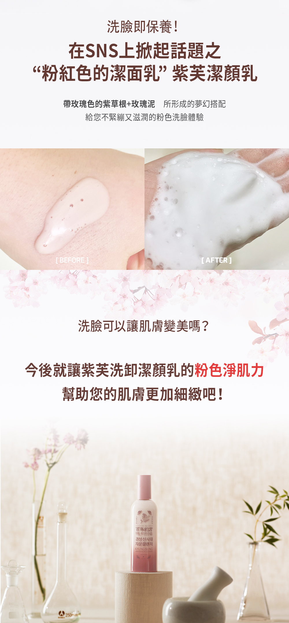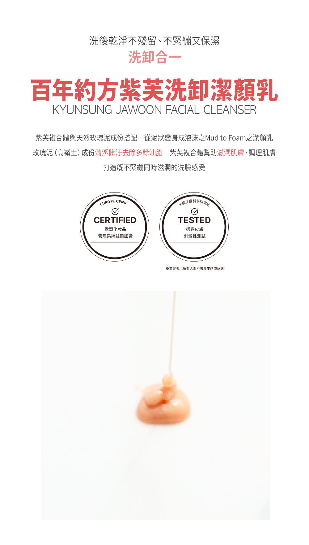 | 如何使用 | 取適量潔顏乳於全臉輕輕畫圓按摩,待清洗臉部彩妝、髒污後,以充分沾濕之雙手再度於臉上按摩起泡,後以溫水徹底洗淨,即可一次完成卸妝及清潔,不需再次洗臉。 |
